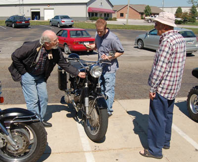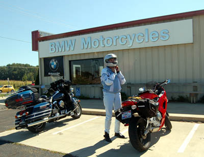 Unfortunately, the handling on the BMW started to deteriorate. Examination showed that there was a slow leak on the rear tire. Fortunately, Dick had a tire gauge with him which helped diagnose the problem, and Carol had a book with her that listed bike shops in Ohio.