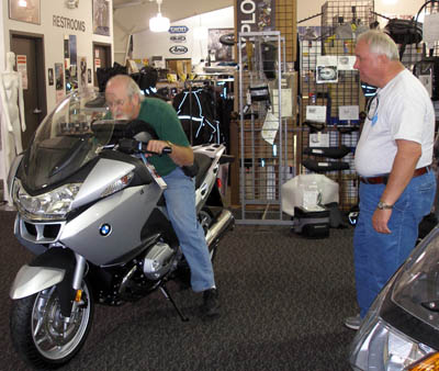 While waiting, Bill tries on a new BMW. Carl looks on dubiously.
