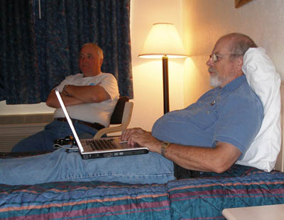 Since it was about 4:30 by the time Bill's bike was done, we decided to stay in Wooster for the night. Bill is working studiously and industriously at this web site, while his mean cousin takes a candid shot showing just how well he has been eating on this trip!