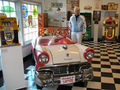Carol was intriqued with this mini Ford fairlane. It looked like it was built from real body parts cut down, and mounted on a golf cart.