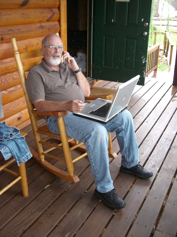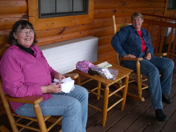 Walking back to the cabins we got soaked in a pretty heavy rain storm, so we decided to wait it out. Margaret and Brenda porchin' it.