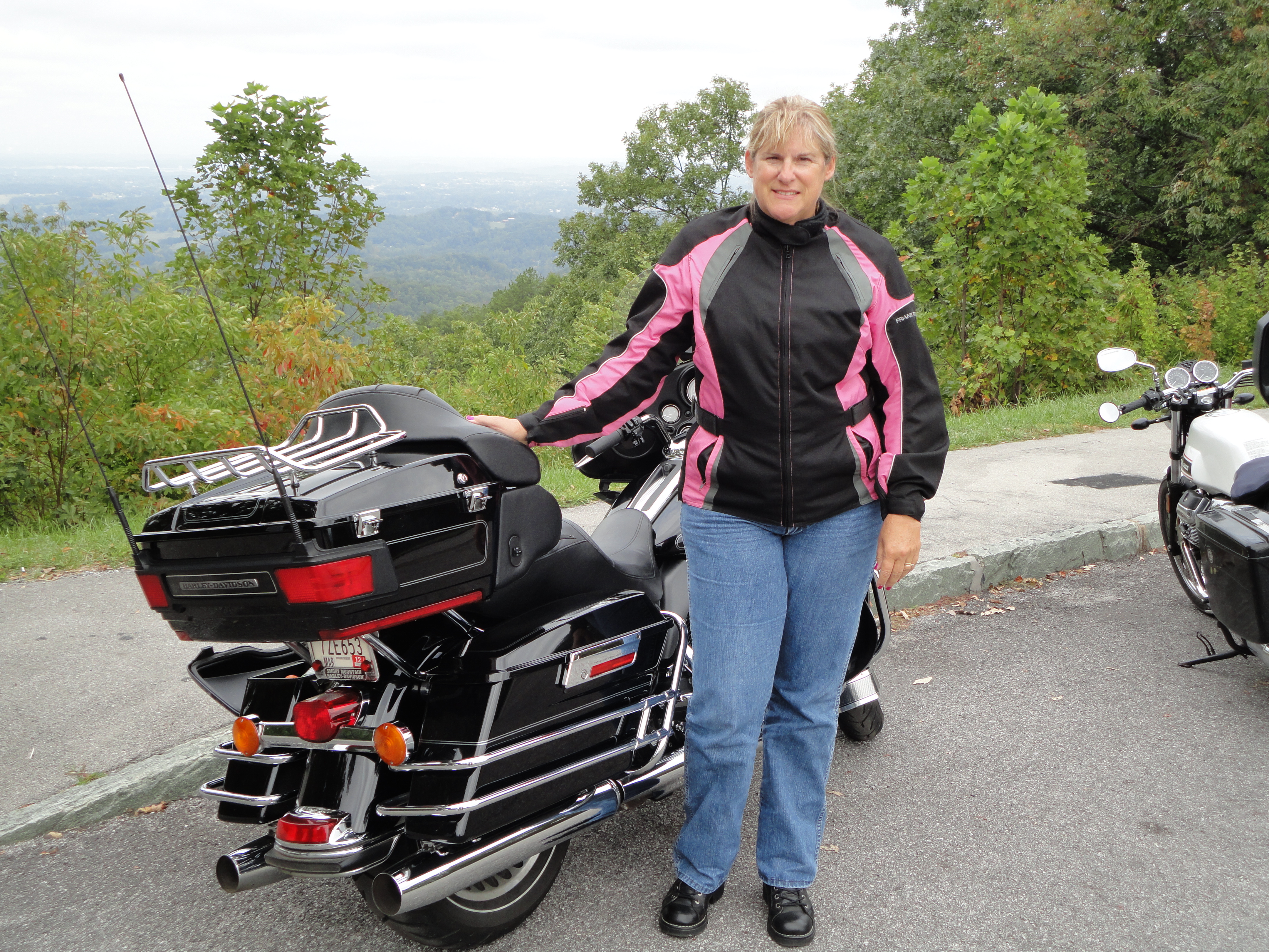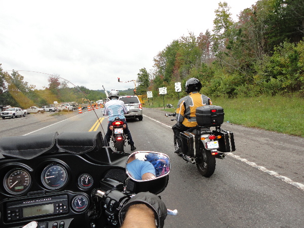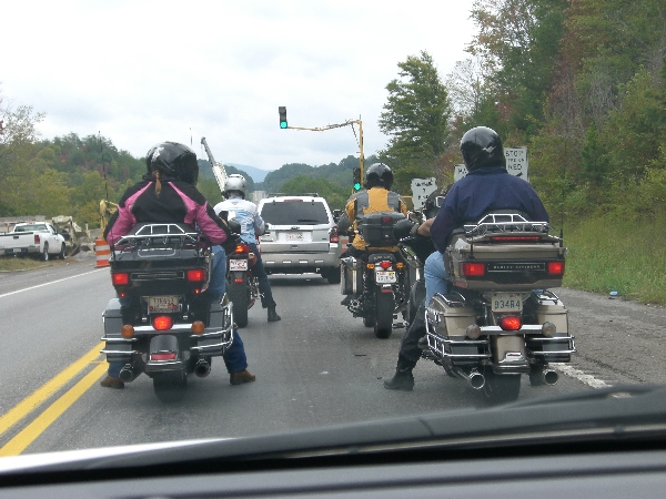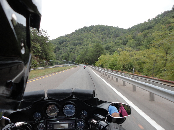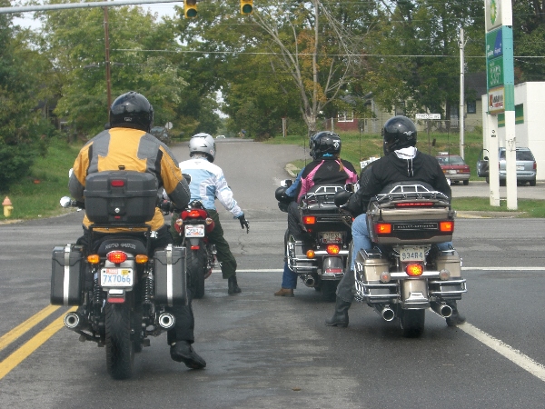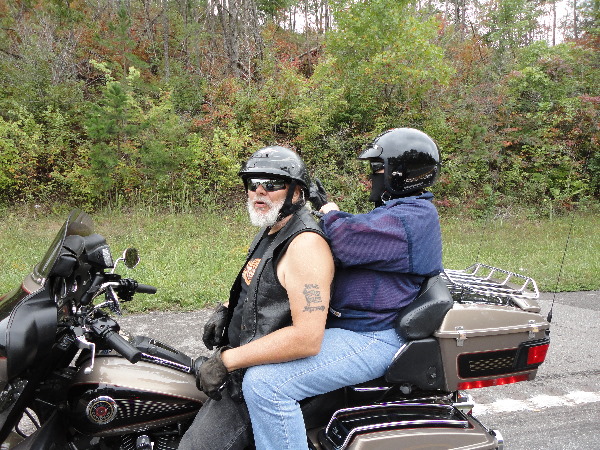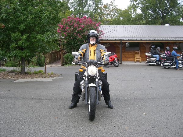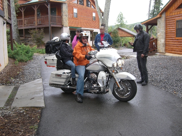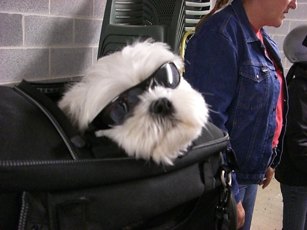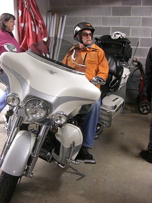 Finally it cleared, so we got ready to go. Brian's crew were heading to Nashville, so we watched them load up. Cueball enjoys riding on the bike, but as soon as they stop he wants the goggles off!