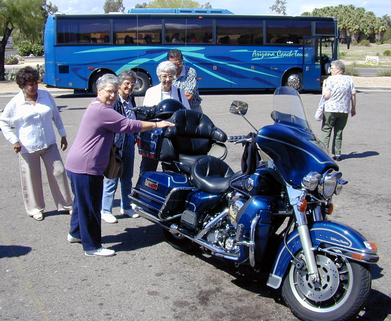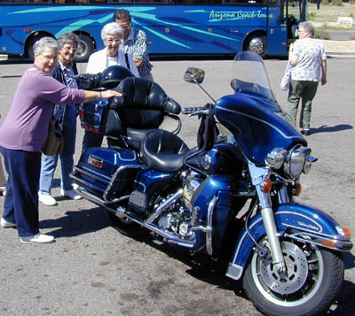 There was a tour bus getting ready to leave, and several of the ladies fell in love with Carl's bike. One even sat on it! The bus driver also owns a Harley, and he had quite a discussion with Carl. One of Carl's gifts is the ability and desire to talk with everyone he meets, and we met a lot of great people on this trip because of Carl!