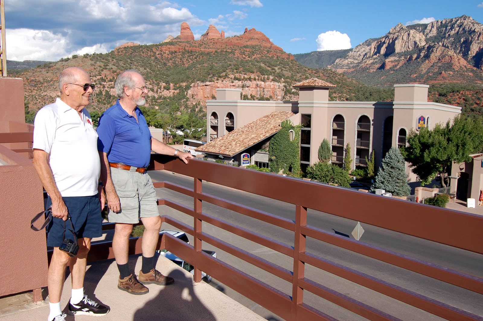 The motel in Sedona was really nice. Were were on the third floor, with a balcony overlooking the main drag. Here are a couple of shots of us hanging out on the balcony, and of the view from the balcony.