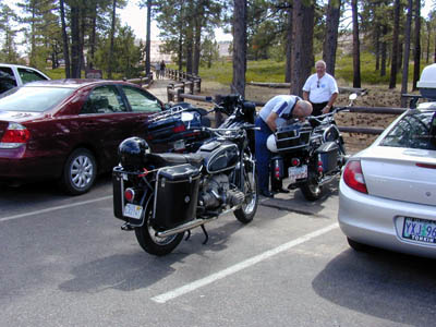 This is the parking lot for the first overlook. Dick is locking his helmet to the bike.