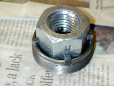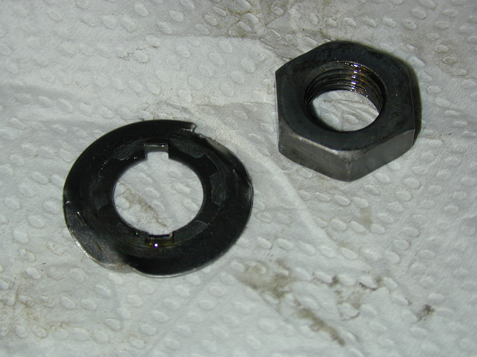 Here are the washer and nut. The washer has two tabs that extend into the grooves on the splined coupling, keeping it (the washer, and thus the nut) from rotating. I hope I can get a new washer.