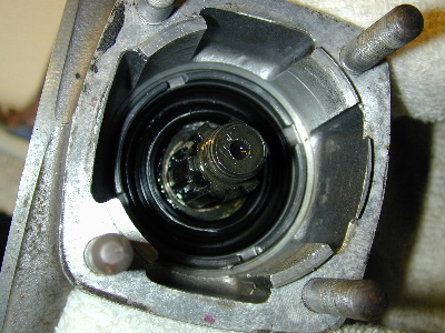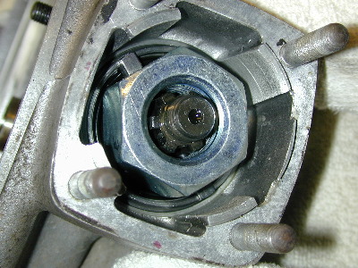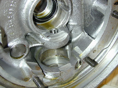 The slotted treaded ring which holds the double ball bearing in place is now exposed. The grease seal shown is actually mounted in the ring. The second special tool that I bought engages the four 6mm slots to unscrew the ring.