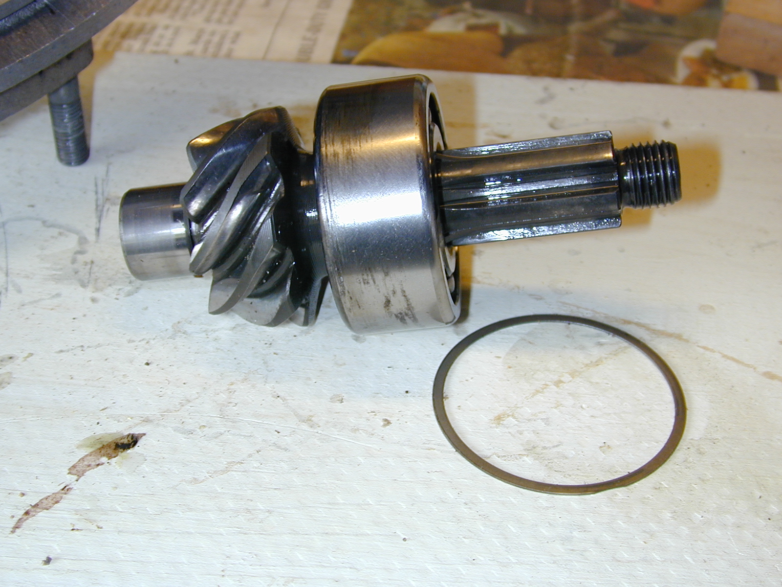 Here is the pinion shaft, with the threaded ring removed. There is a spacer shown in front of the bearing.