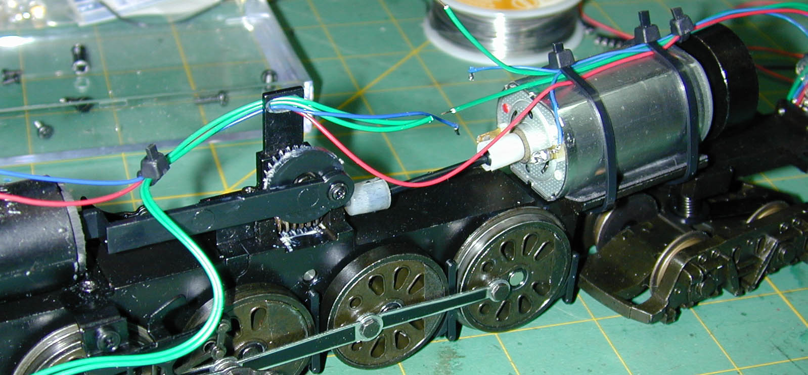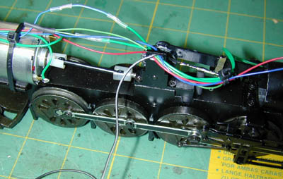 Here's the chassis. The 2 blue wires that go to the motor terminals need to be desoldered. Cut the 2 green wires going to the headlight such that they will reach the motor terminals. I number the pins on the smoke switch/plug 1-4, left to right, looking from the rear of the loco. The green wire from pin 1 goes to the right side terminal, the green wire from pin 4 to the left terminal.