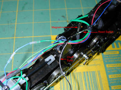 Here's another view of the switch and magnet. One side is connected to the extra wire you connected to the blue wire from pin 3. The other side of the switch is a wire which will be connected to the Tsunami sync wire from the tender.