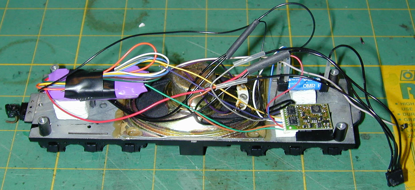 I mounted the various devices before any wiring. I used a Miniatronics large oval speaker. This was actually a bit too wide to fit in the tender, so I gound a little off each side to make it fit. I then glued it in place using goop. The Lenz decoder was mounted using double-sided foam tape contacting only the plug. I put a piece of electrical tape on the tender floor under the decoder to prevent a short if the decoder should come loose or get pushed down. The Tsunami had to go over the speaker a little to fit, so I mounted it on a small block of foam using goop. I also used a foam block for the relay.
