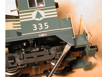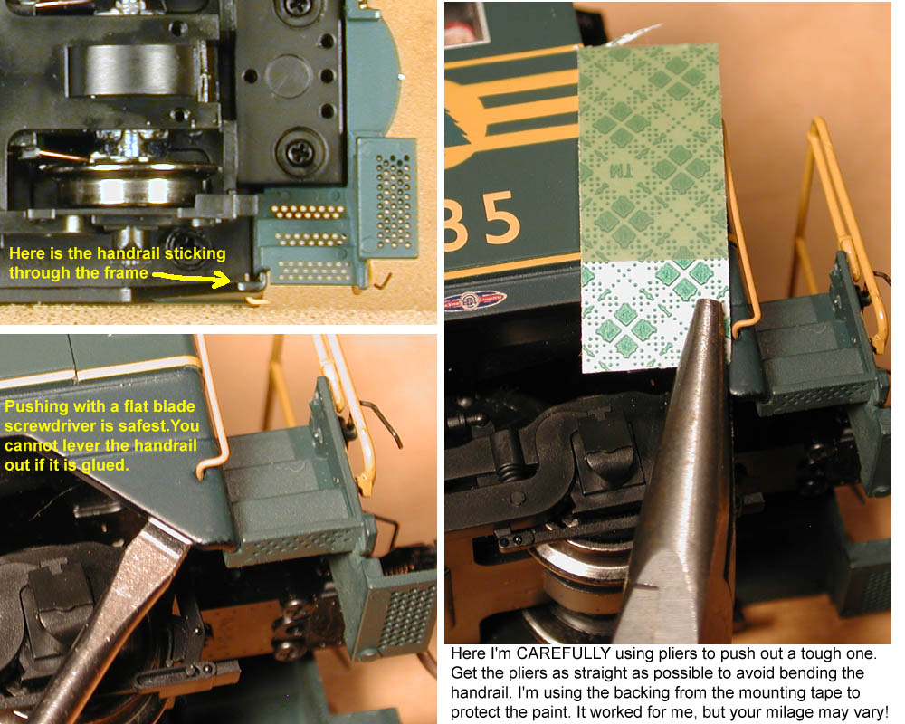 3. Carefully pull out the bottom end of the vertical handrail which goes between the shell and the frame. On my loco it was only glued at the top, so it popped out of the bottom easily. The latest SW-9/NW-2 seem to be firmly glued. I found the best way to get them out is push them out from inside the frame, using a flat screwdriver, or in tough cases using small needle-nosed pliers. Click the picture on the right to see more detail.