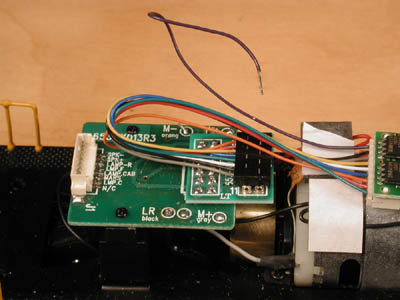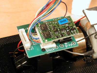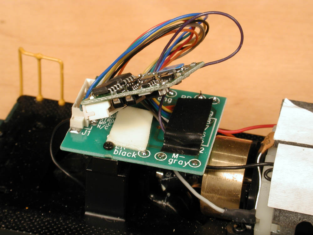 7. I put a piece of electrical tape on top of the plug, and over pin 12. This is to ensure there will be no shorts, and it also makes the wire in pin 12 more secure. Use a piece of double-sided foam tape to secure the decoder to the PC board. Don't cover the socket for the plug from the shell. Be sure there is no way any components on the decoder can touch anything except the tape. If you are not going to install a sound decoder, you can mount the Gold-JST on the motor, where there is lots of room. I'm going to add sound, so I put it on the PC board out of the way.