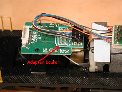 6. Plug the Gold-JST into the socket. Notice the orientation of the plug (wires point to the front of the loco) and be sure to plug it into pins 1-8 on the socket. That means there will be one empty row of sockets visible above and below the plug. There is one extra lead (wire) on the decoder. If your SW-9 has cab lights, plug that extra wire into pin 12. otherwise, insulate it with electrical tape and don't use it. I stripped about 1/4" of wire, and carefully tinned it with a soldering iron to stiffen it before inserting in the socket. You could also solder the wire to the socket. (This picture shows an experimental adapter board on top of the PC board. You'll be plugging directly into the socket on the PC board).