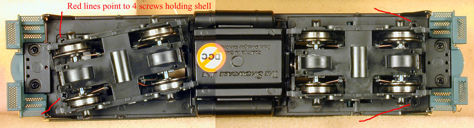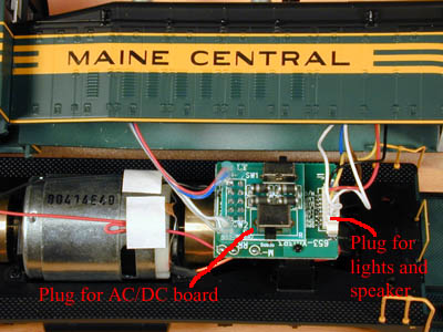 Here is the shell and chassis before removing the AC/DC board. Note the "no DCC" sticker on the pC board in the loco. That means that the pins in the socket are ordered incorrectly for DCC, and will require a replacement board before installing a DCC decoder. If your loco has the "No DCC" sticker, the instructions for swapping in the replacement board are here.