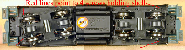 4. Place the loco on a soft surface, and remove the 4 body mounting screws. I used a Phillips screwdriver marked PH 000x40, and it seemed a good fit. The body should then easily lift off until you can reach the plugs inside.