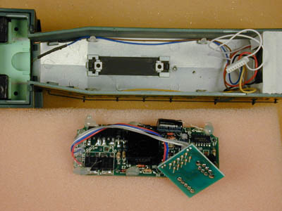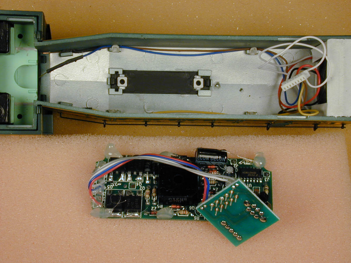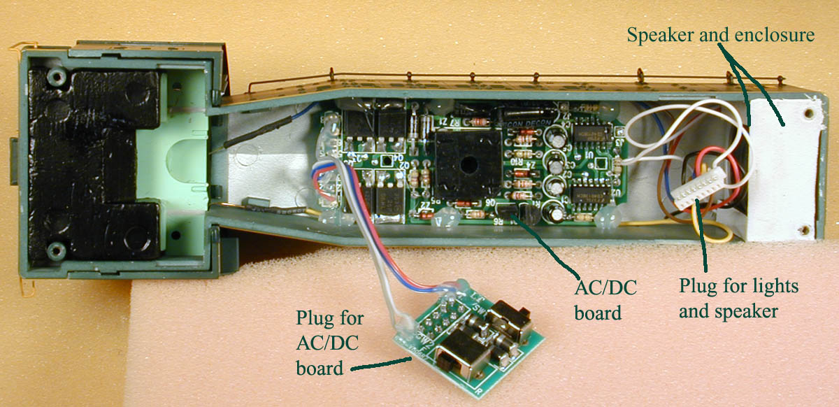 5. Depending which version of the SW-9 you bought, you may have a DC shorting plug, AC/DC board, or LocoMatic board installed. Unplug it, and remove whichever board you have. This picture shows the AC/DC board. I used a small flat blade screwdriver to gently lever the larger plug out, doing a little at a time from all four sides to keep it parallel to the socket board. The other plug cab be pulled straight out, but don't pull on the wires. Take your time and you won't bend any pins.