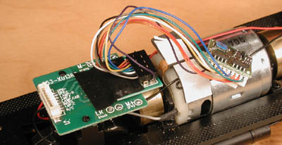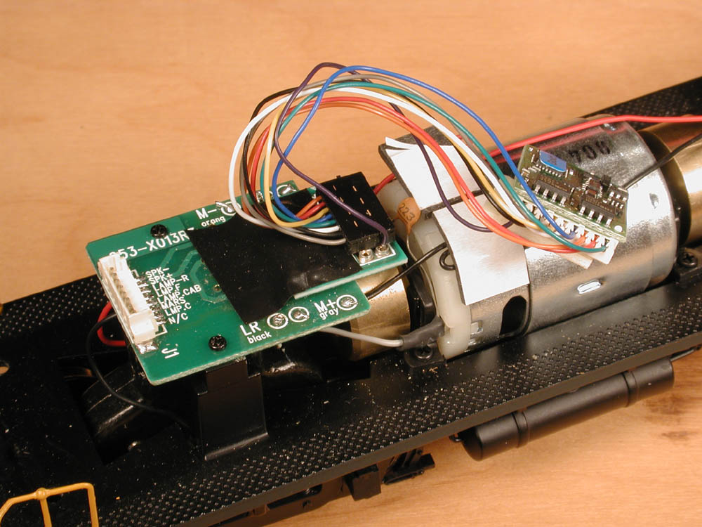 Here is the left side, showing where the black wire connects to the "LR Black" terminal on the loco PC board. Before connecting the black wire, however, we need to do some preliminary programming.