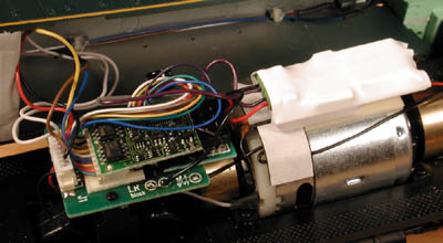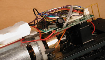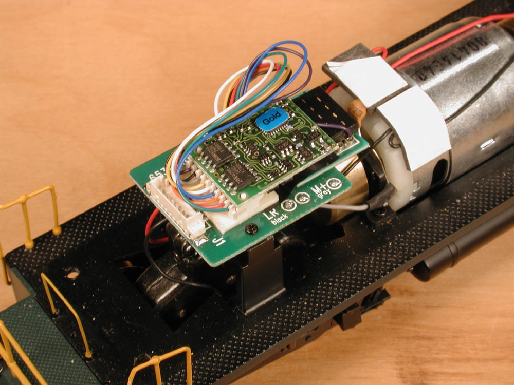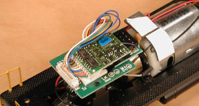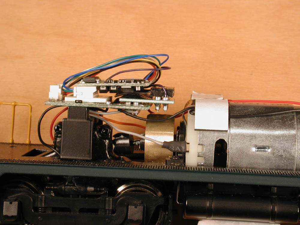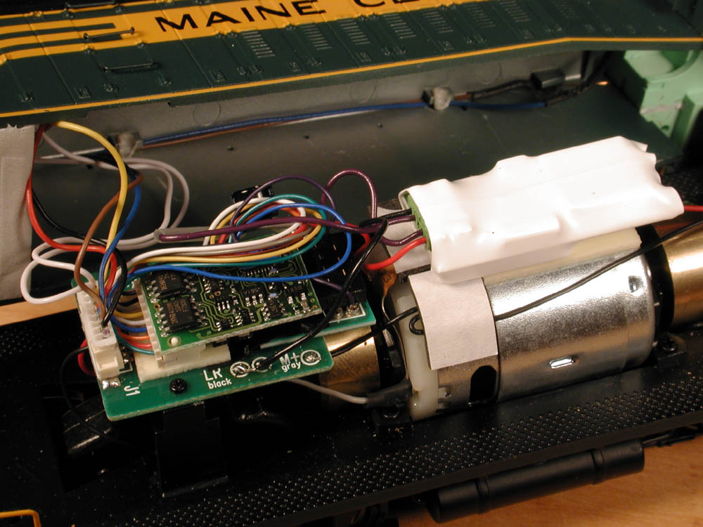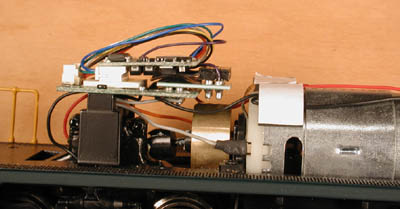 Here's a view from the side. There is enough room to mount the decoder securely and with no chance of any metal on the decoder touching any part of the locomotive. Just take your time, and try to make it neat. Make sure you don't cover the socket for the plug from the body.