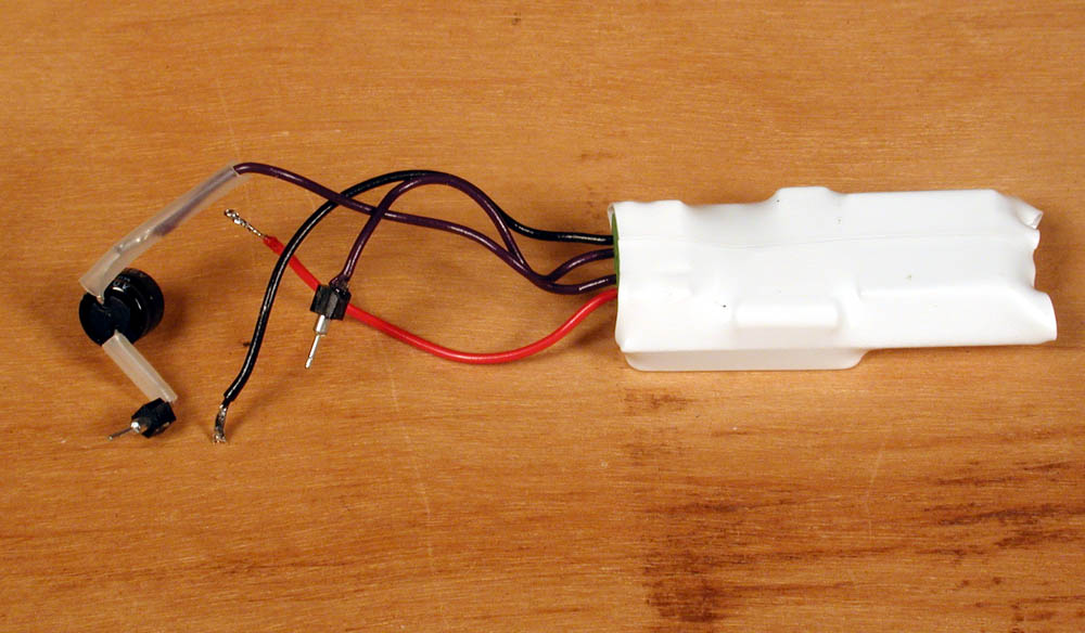 Here is the SoundTraxx DSX sound decoder. There are only 4 wires: Red and black are for power and connect to the red and black solder pads on the loco pc board. The two violet wires go to the speakers, and connect to pins 9 and 10 on the loco pc board socket. To prepare it for installation I cut the wires to about 3" long, stripped 1/4" of the insulation off each wire, and tinned them with a little solder. The violet wire next to the black wire needs to have the supplied capacitor soldered to it. I put a 1" piece of shrink wrap on the wire first, than slid it over the bare wire on the capacitor for insulation. The photo shows small pins soldered to the other lead on the capacitor and the other violet wire. These turned out not to fit, so just ignore them.