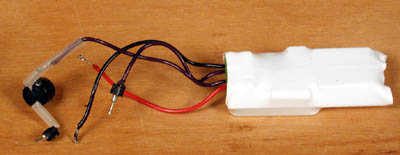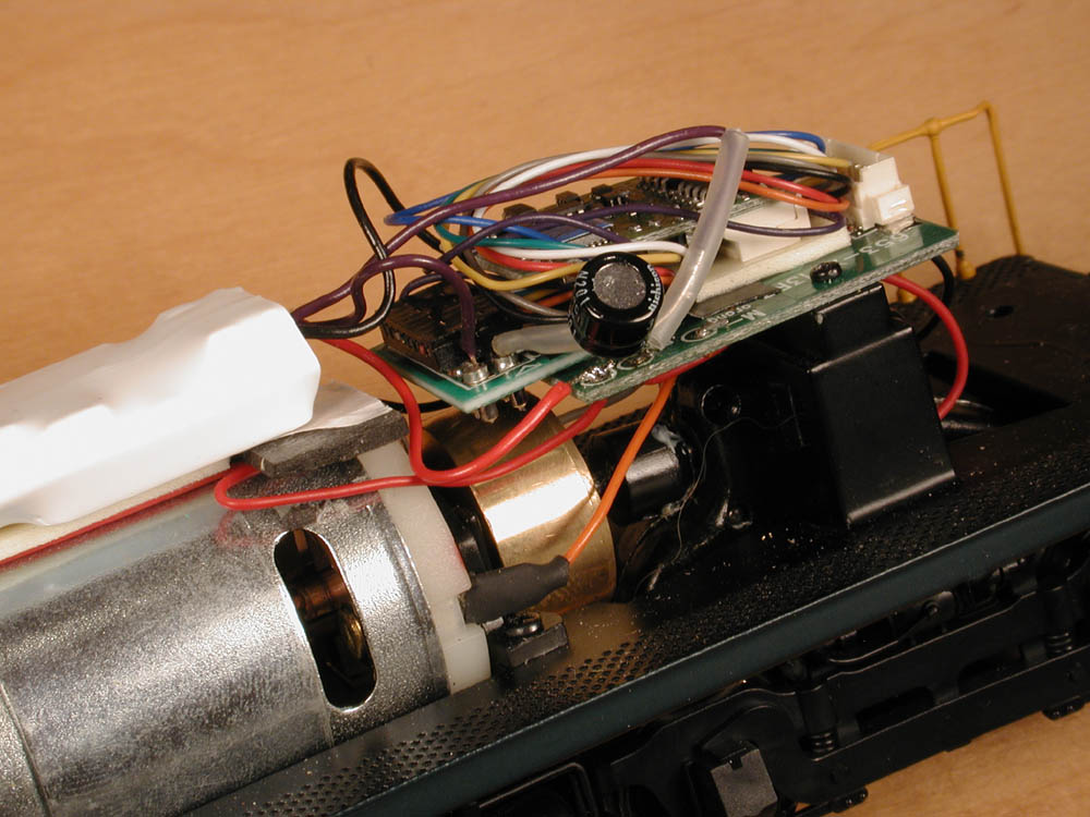 The DSX is mounted on a piece of double-sided foam tape on the motor. The red wire is soldered to the "RR Red" solder pad on the loco PC board. The violet wire and the lead from the capacitor are plugged into pins 9 and 10 on the socket. In this case, both wires seemed secure just pushed into the socket, so I did not solder them. To be sure, you could just touch them with the iron.