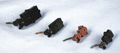 SHS 01295 couplers look and operate similar to the Kadee 808. The knuckle is slightly smaller, thus closer to scale. They allow automatic coupling and automatic or manual uncoupling by magnets. They do not reliably support "delayed uncoupling". There is much less slack in the couplers as compared to Kadee 802/808 (a plus in the eyes of many modelers). They have a smaller coupler box, thus will sometimes fit where there is not enough room for an 802. They are only supplied rust colored. They came pre-assembled (a BIG help)! The knuckle is .045" lower in relation to the mounting surface of the coupler than is the Kadee 802/808. This makes it ideal for the SHS open top hoppers and ore cars and SW-1/SW-9 locomotives. Other applications may require a bolster shim.