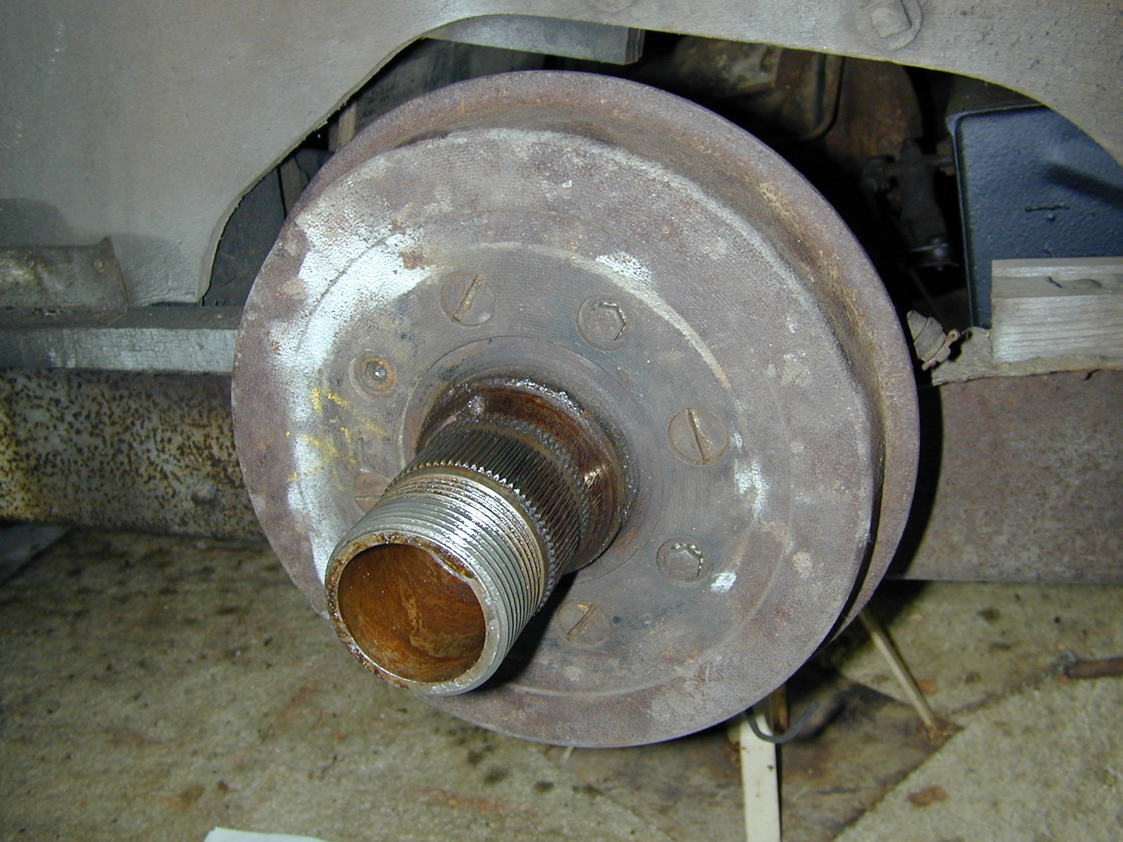 Anyway, I removed the rear wheel. There are 4 small hex bolts that hold on the drum. The round-headed slotted screws are for positioning, and don't have to come out. I didn't know that, and removed them as well. It was obvious that the hub was loose on the shaft. It could rotate a few degrees and wobble without the axle shaft moving. To remove the hub I needed to remove the cotter pin from the axle shaft. Removing the cotter pin at the bottom of that tube was a real battle, but I finally got it off. The nut was tight, about 40 ft-lbs. The hub, despite being loose on the axle shaft required a puller, but not very much effort. I think the washer was preventing it coming off easily.