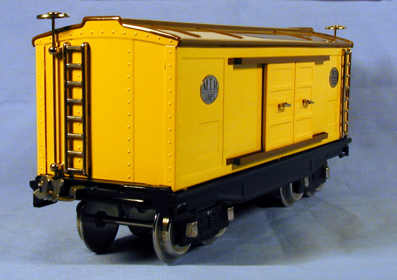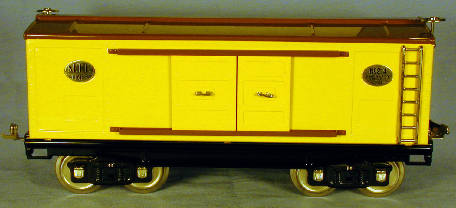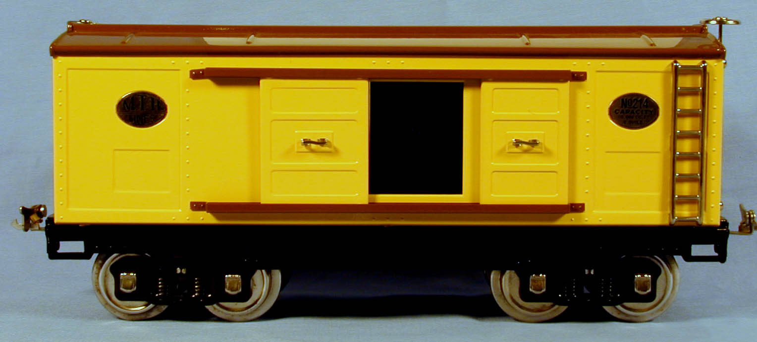 This is an MTH Tinplate Traditions reproduction of a Lionel 214 Standard gauge Box Car. Box couplers on both ends. Two sliding doors on each side.