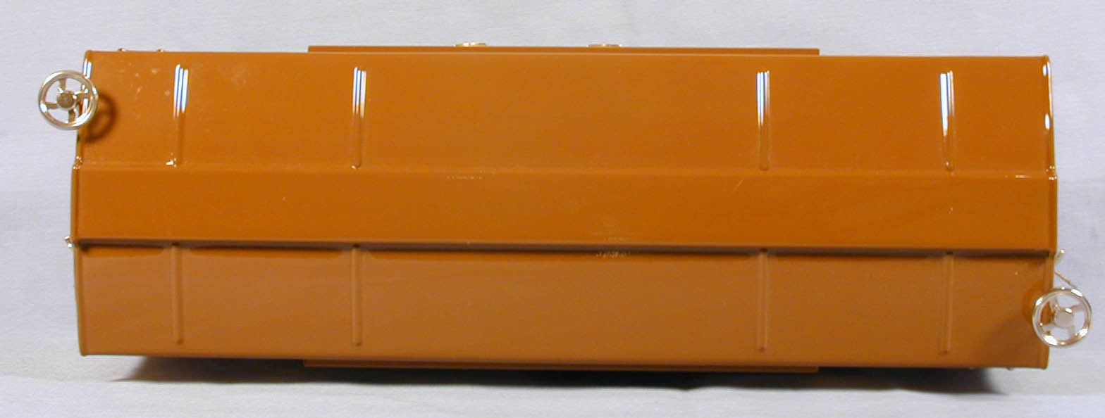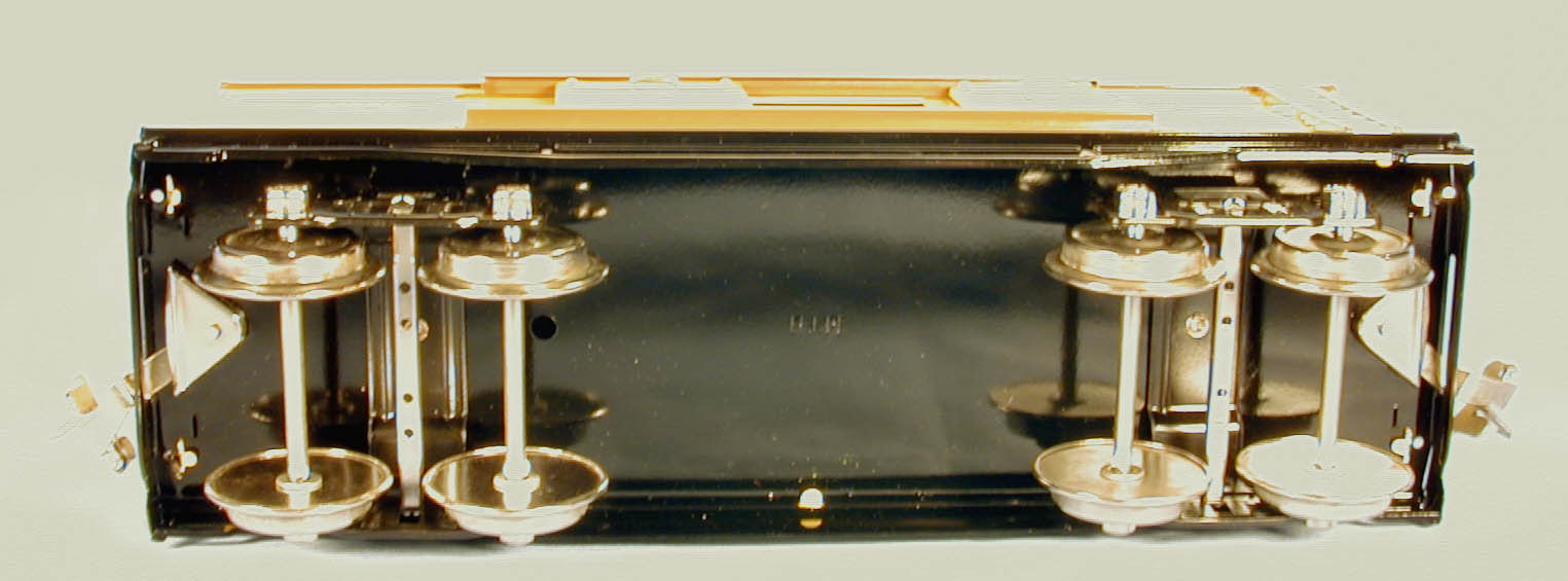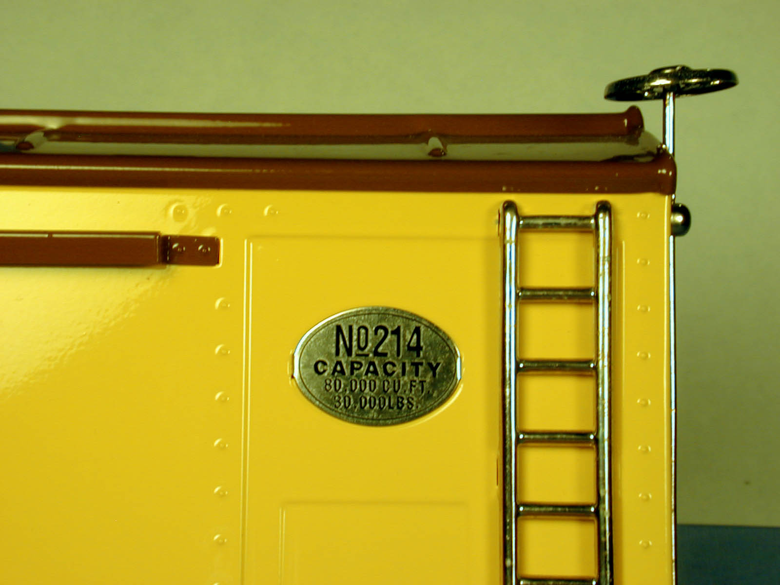 This is an MTH Tinplate Traditions reproduction of a Lionel 214 Standard gauge Box Car. Box couplers on both ends. Two sliding doors on each side.