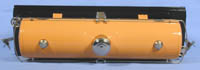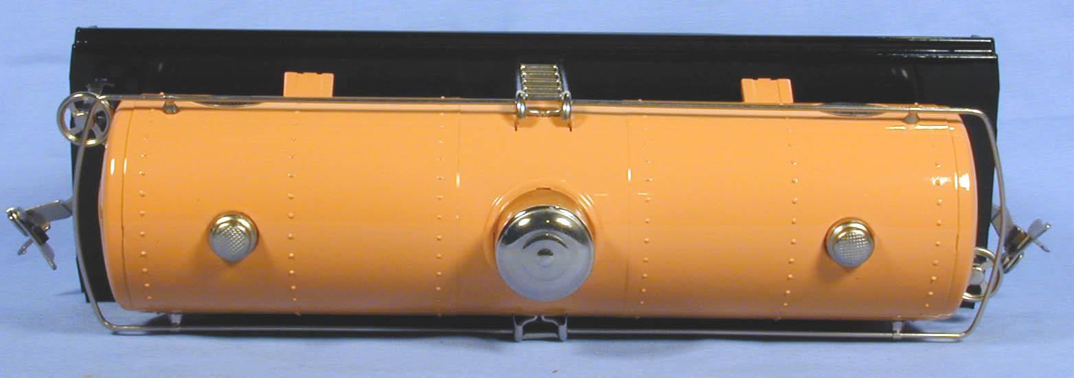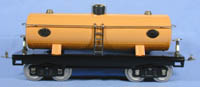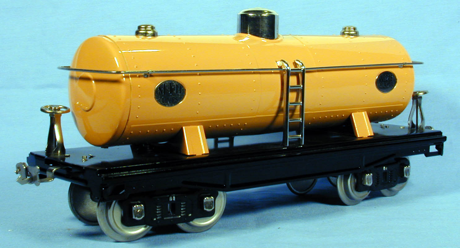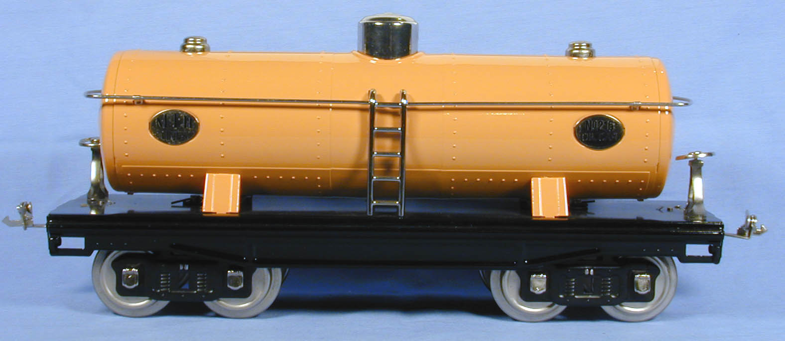 This is an MTH Tinplate Traditions reproduction of a Lionel 215 Standard gauge Tank Car. Box couplers on both ends. The car is Orange with a black chassis and nickle trim.